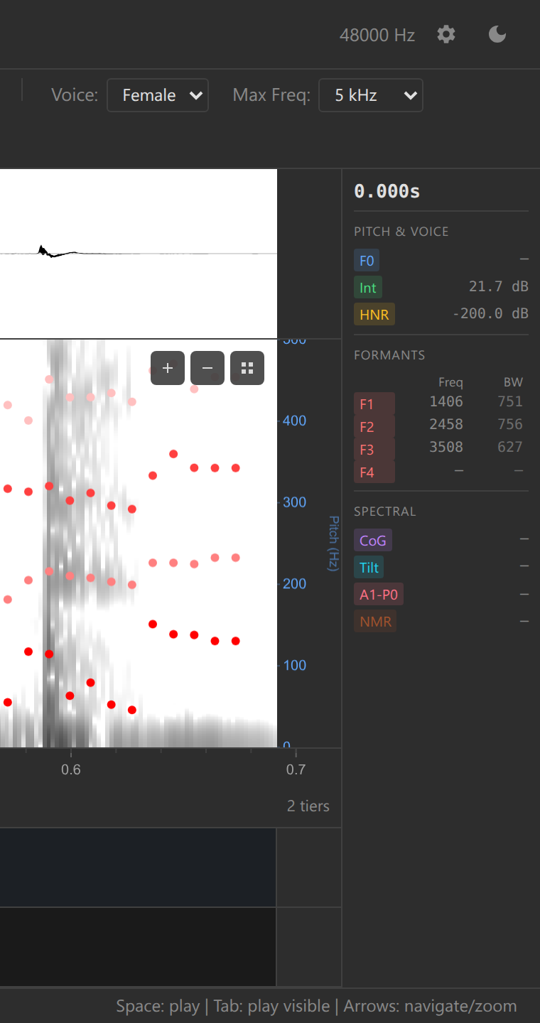 Now that you can navigate the audio, let’s enable acoustic overlays to see pitch, formants, and intensity.