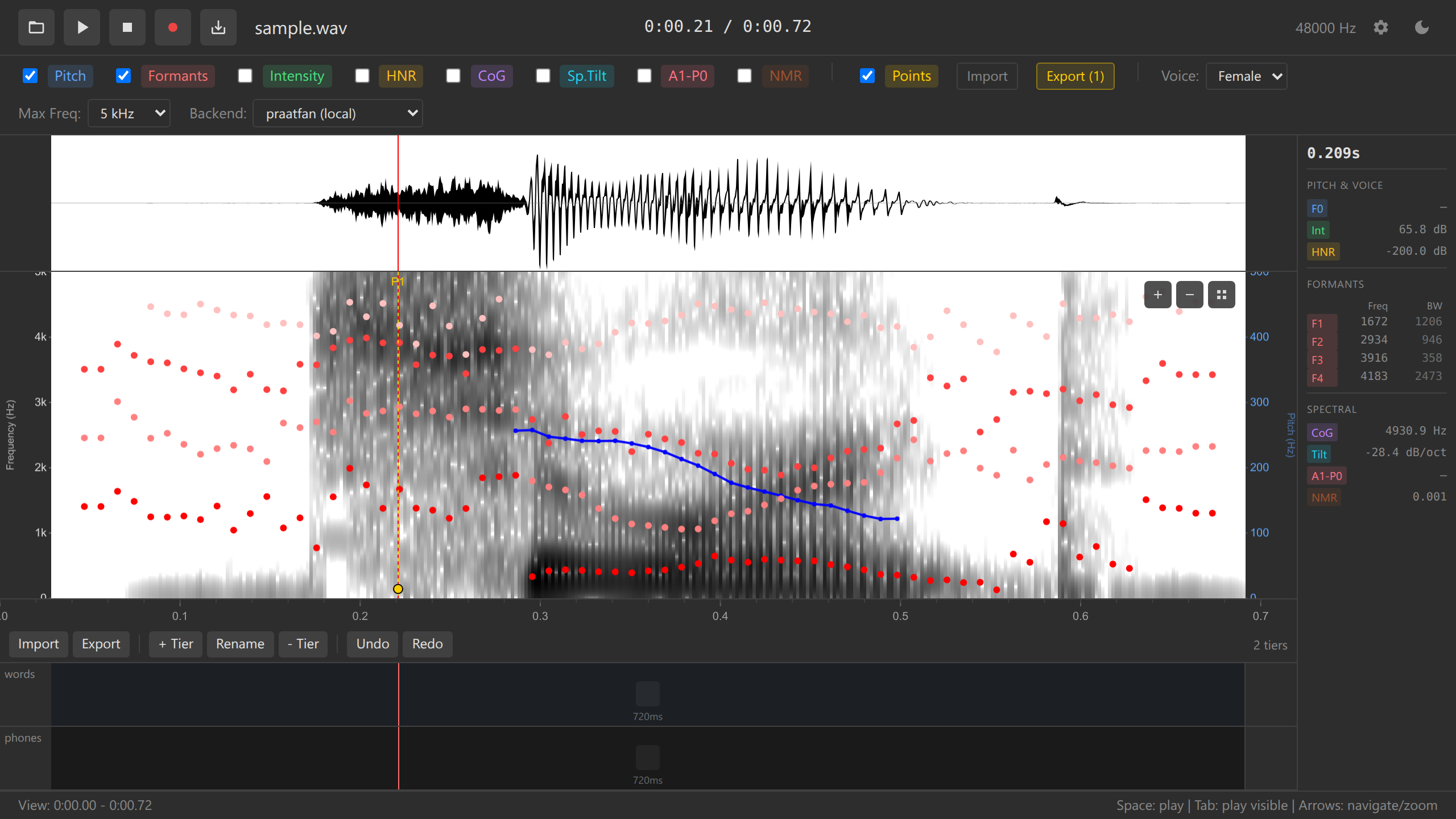 - Annotation tiers are below the spectrogram; click in the colored frequency display